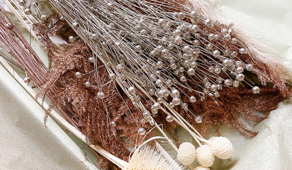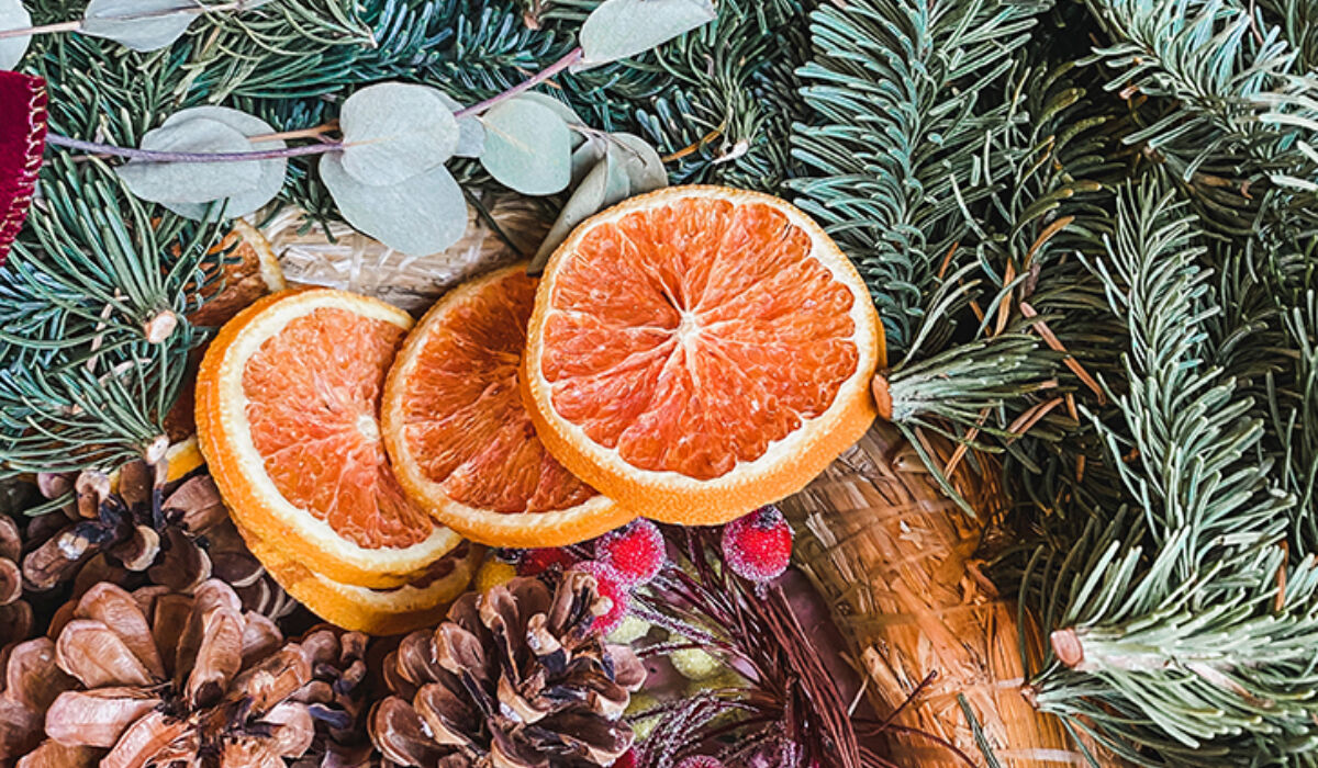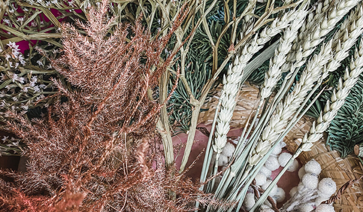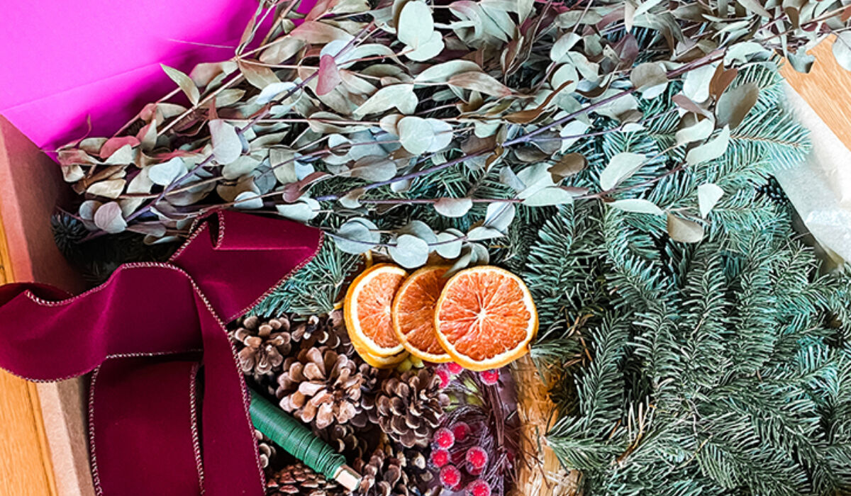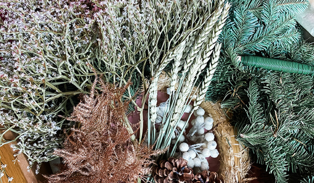 Decor - classic - dried oranges, preserved berries, pine cones and a velvet red bow. Boho - dried statice, preserved ferns, dried wheat grass, preserved berries and pine cones