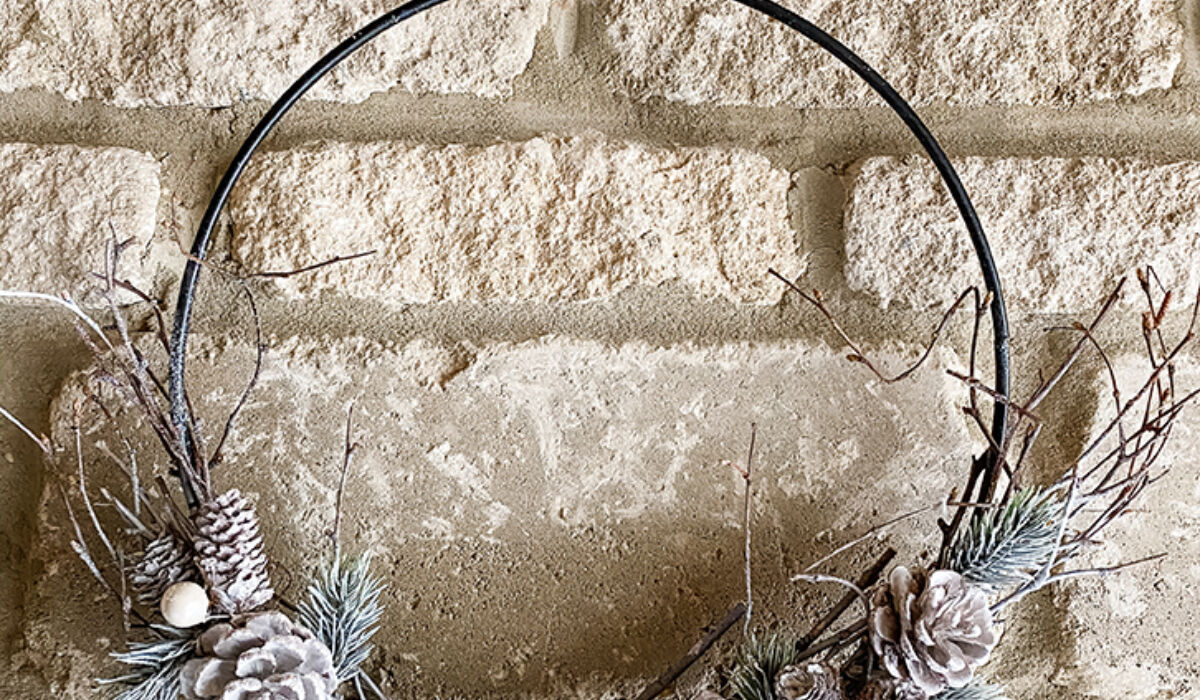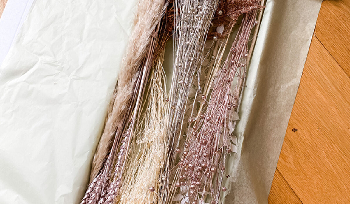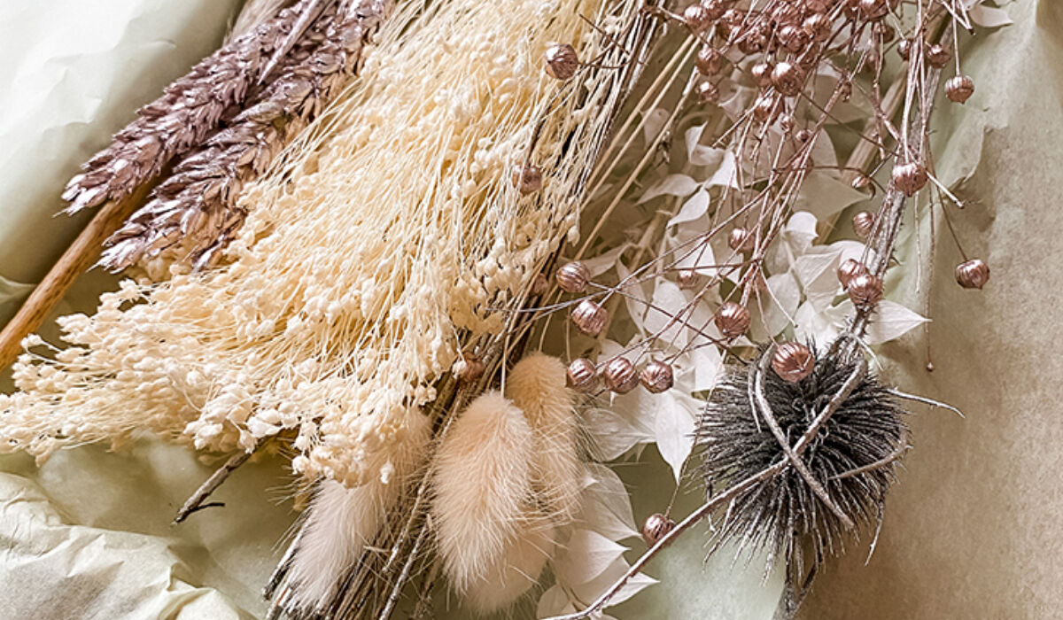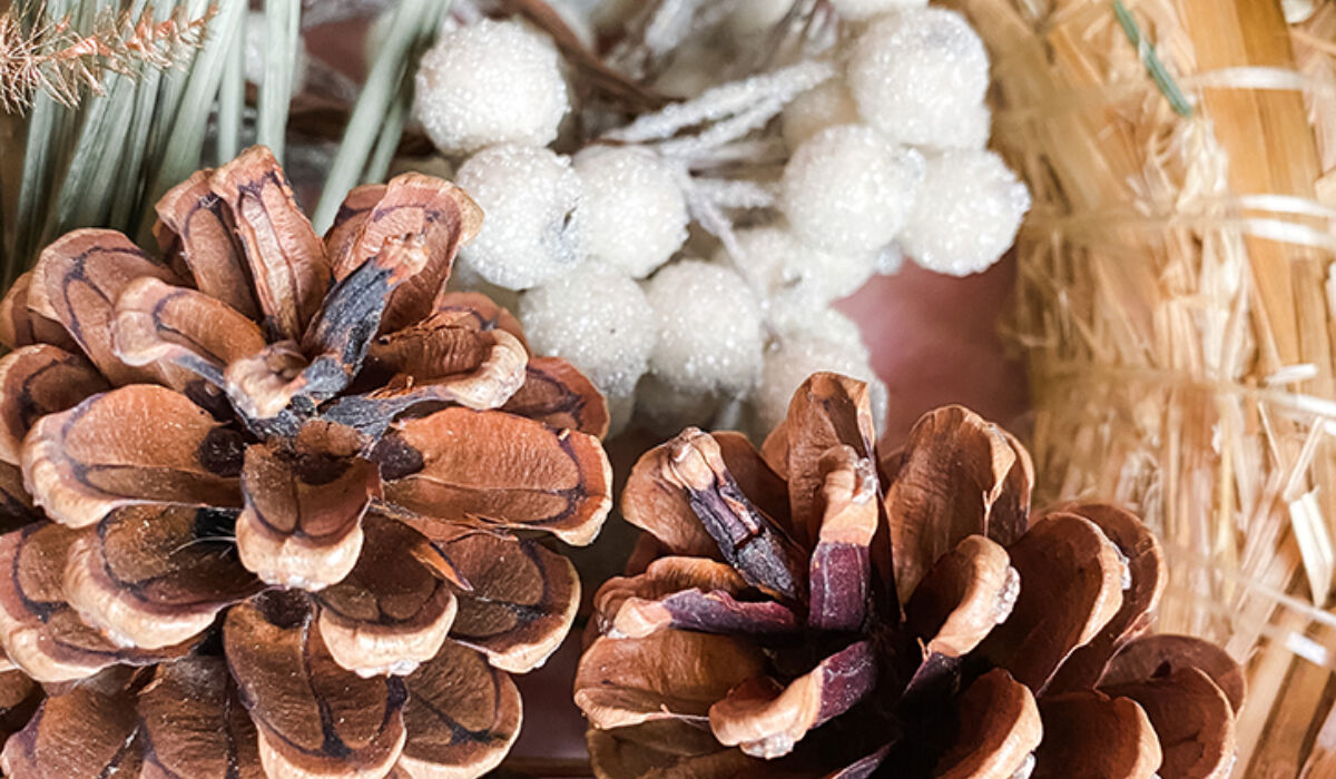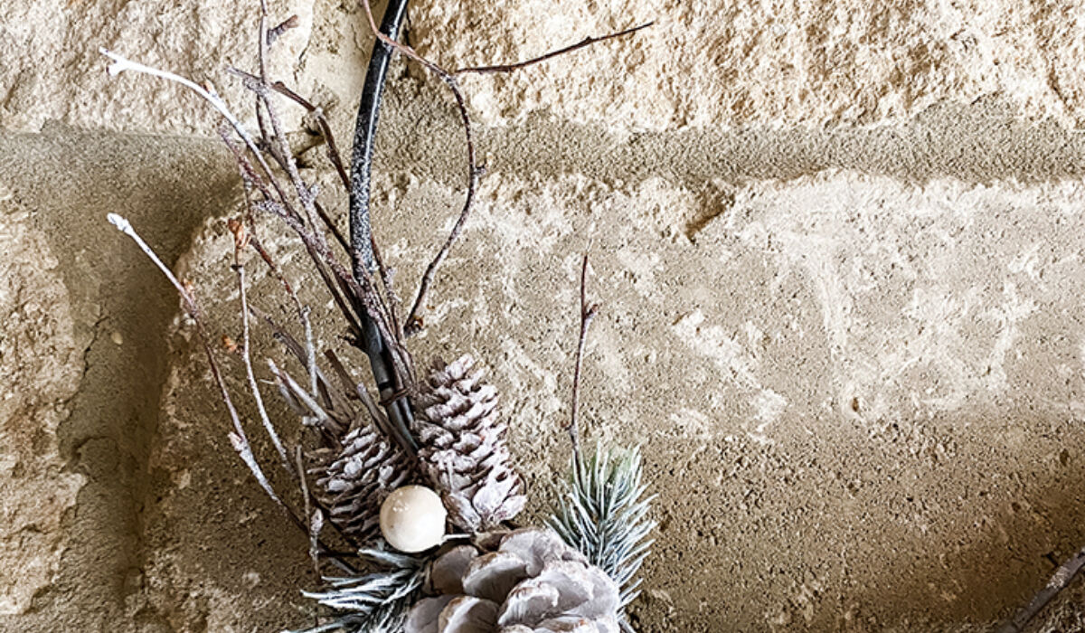 Decor - classic - dried oranges, preserved berries, pine cones and a velvet red bow. Boho - dried statice, preserved ferns, dried wheat grass, preserved berries and pine cones