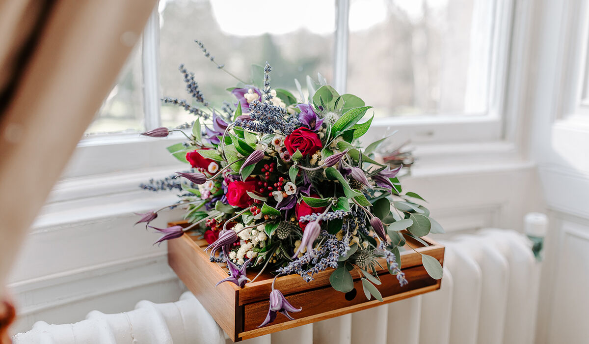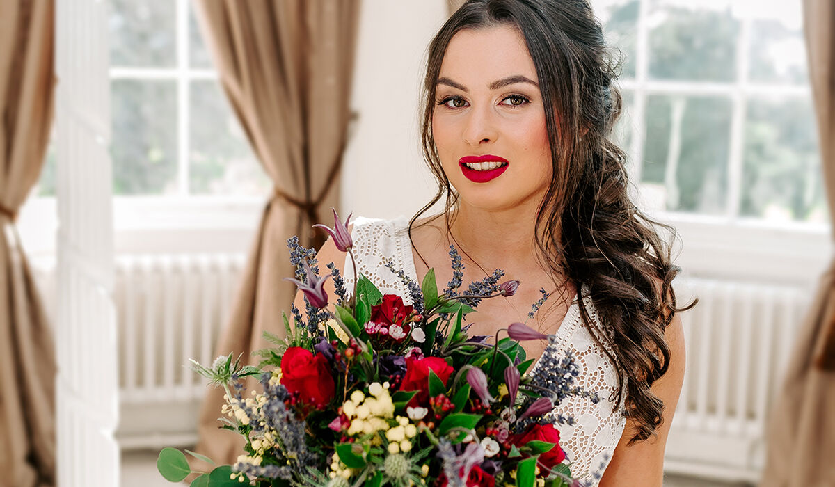 For the second bridal bouquet I wanted to create a 'height of summer' look. I used rich, luxurious and bright colours that would make the images pop. For the flowers I chose; roses, clematis, wax flower, thistle, genista, craspedia with hints of dried lavender for that summer scent. The supporting foliage was the rich green ruscus. This bouquet worked so well with the lip colour matched by Sophie.