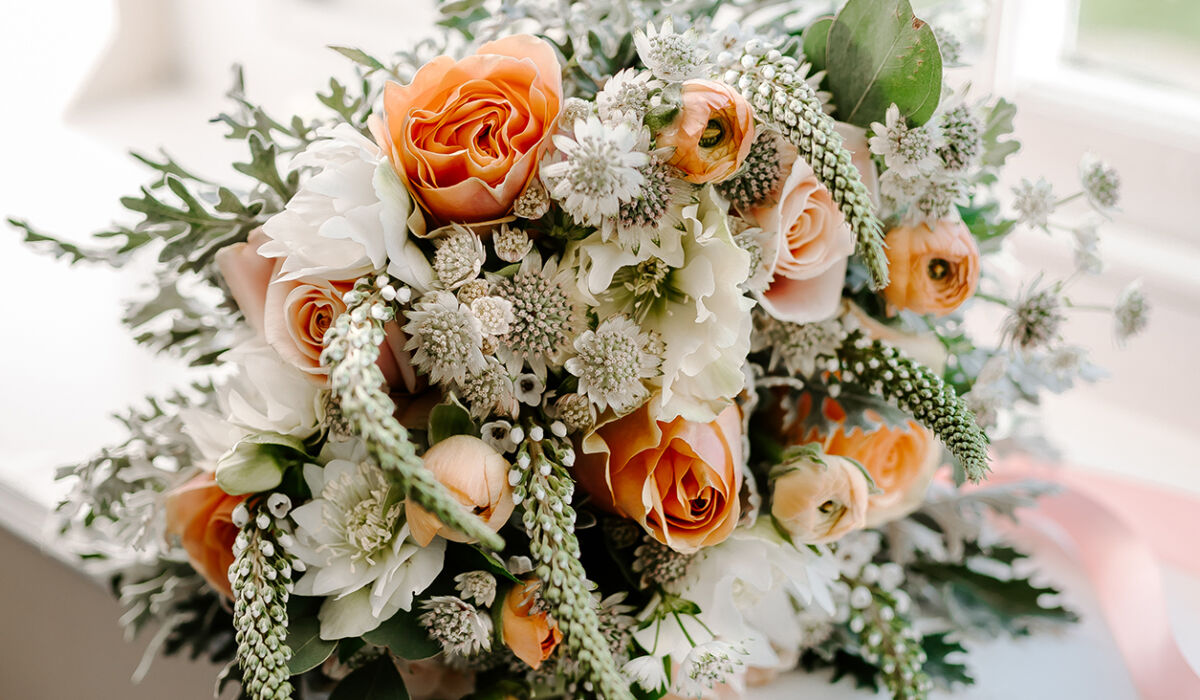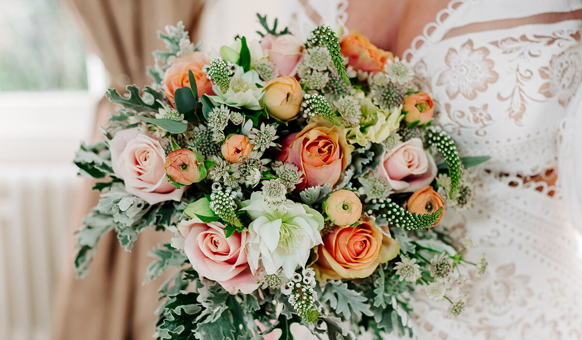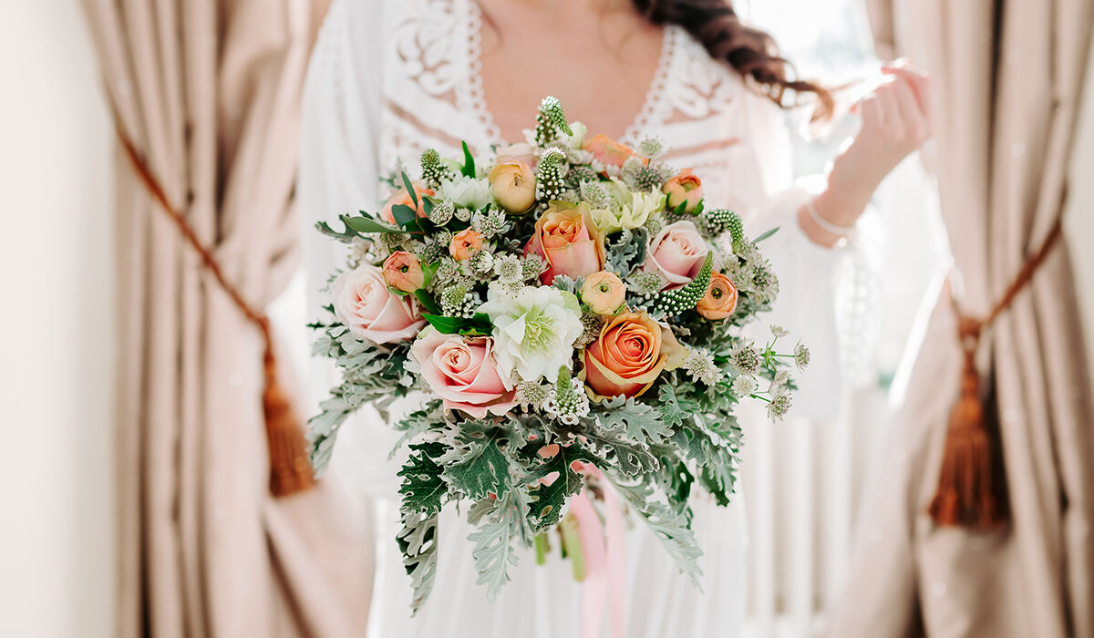 For the shoot I created three different bridal bouquet designs. The first design was a fresh Spring Summer bouquet in gorgeously subtle pastel tones. Quite classic in shape but with a very natural feel thanks to the variety of textures from the flowers and foliages used. In this bouquet I used; roses, ranunculus, hellebore, astrantia mixed with some greenery in the form of pittosporum and dusty miller.