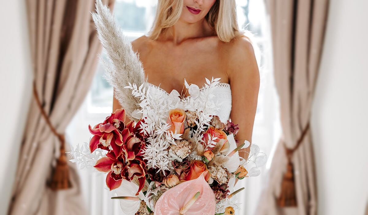 For the final look I wanted to create a show stopper! I really fell in love whilst creating this egg bouquet with the colour tones and the unique flowers used. In this bridal bouquet I used a combination of dried and fresh flowers to include; dried white ruscus, dried pampas grass, dried white honesty, dried bunny tails, an orchid, an anthurium, roses, carnations and lisianthus.
