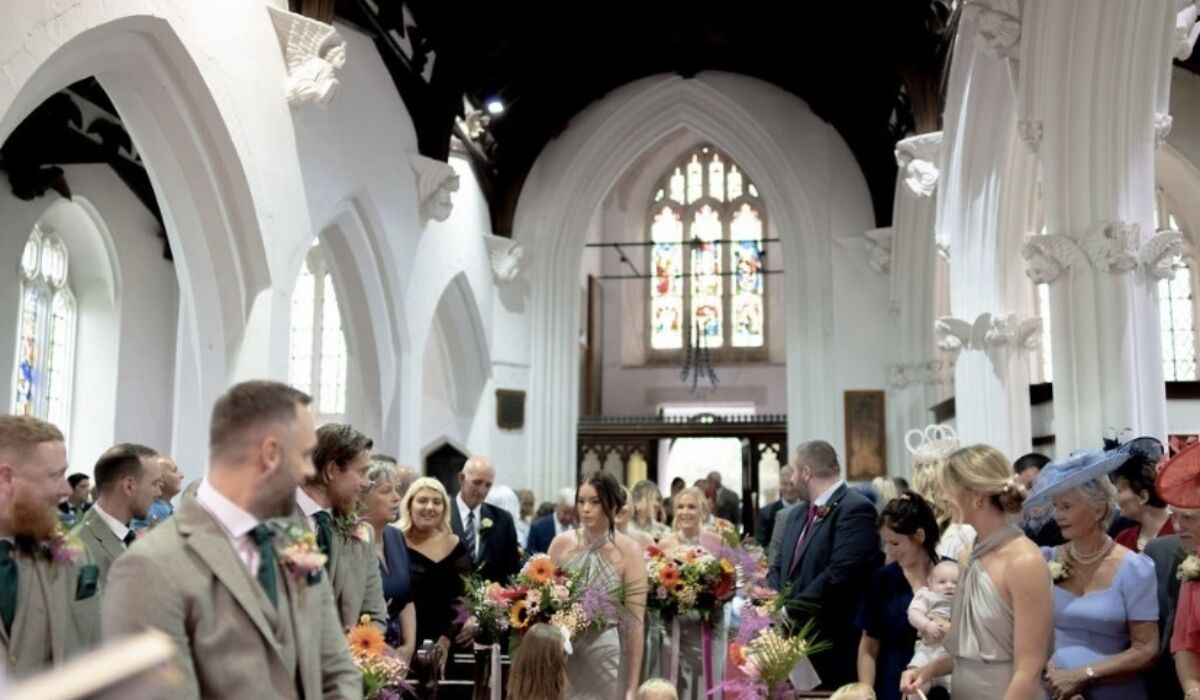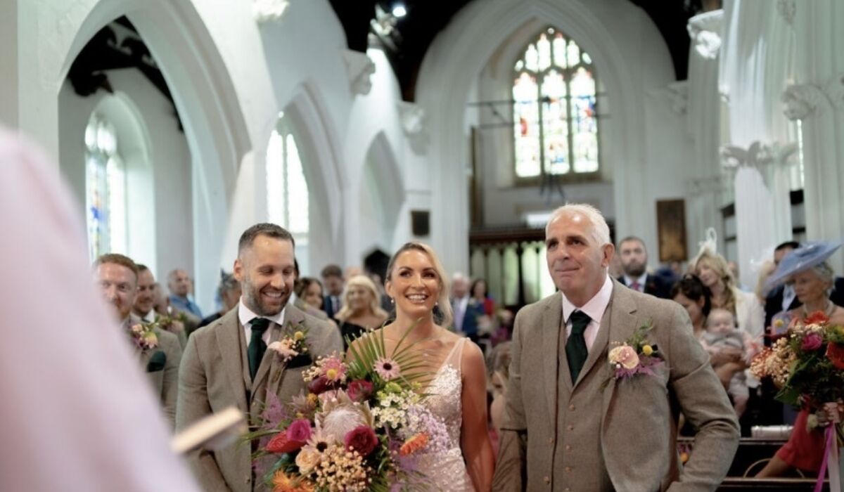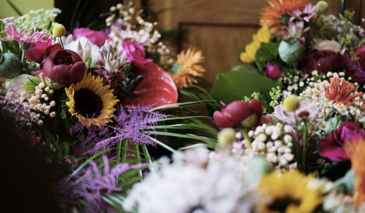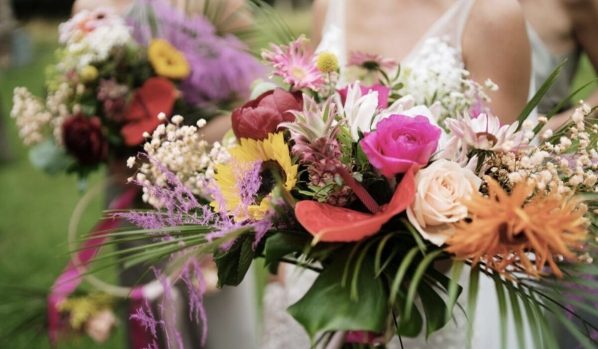 In terms of decorating the venues with flowers we created two large milk churn displays in the church with all the tropical blooms and colours which were complimented with pew ends down the aisle. The bright colours really made the church pop and gave everyone a taste of what was coming. The pew ends stay in the church as a sign of respect but the milk churns were then taken across to decorate the entrance of the marquee.
