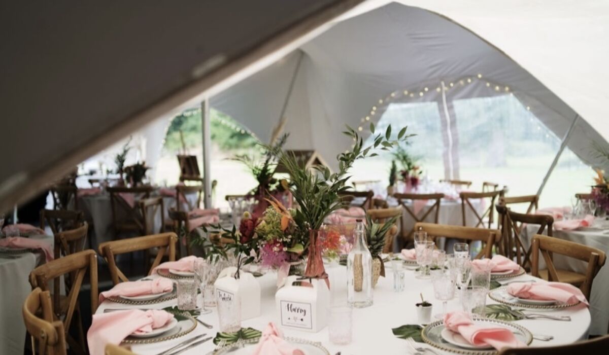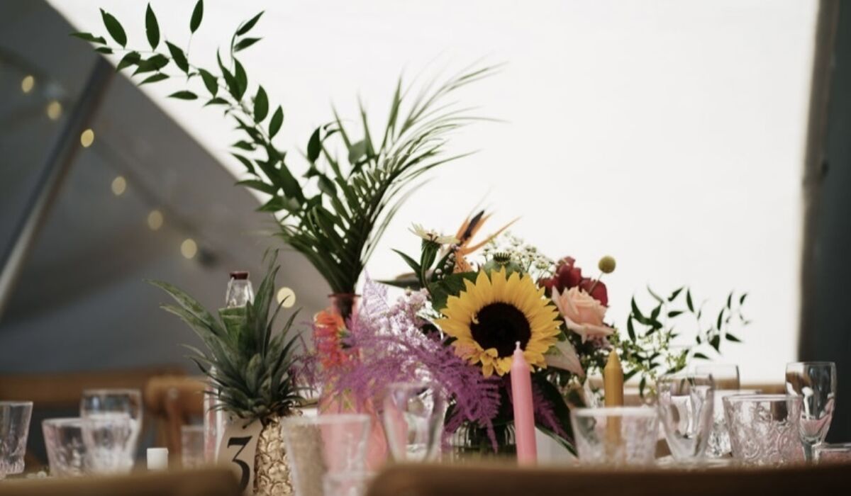The before and after of the marquee really was crazy. Because of the low lighting from the weather on the day it was rather dull when we first arrived as just four white walls. Then as the tables were laid and we added bottles and jars filled with tropical flowers it was transformed into a beautiful and uplifting space full of cheer and colour ready for The Smith's guests.