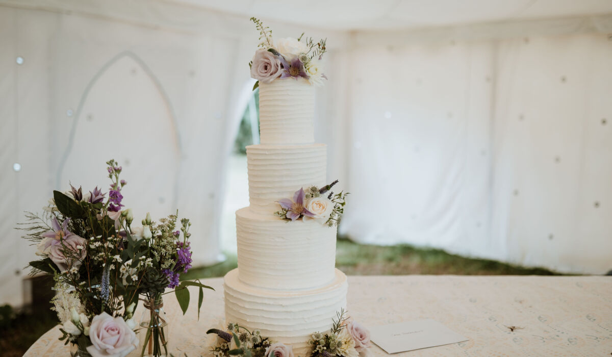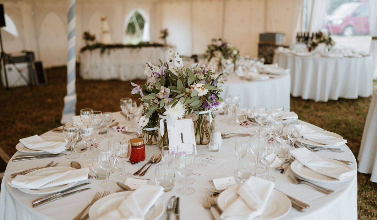 With any reception venue it is truly amazing how the flowers transform it, but with a marquee you just cannot beat adding lots of gorgeous flowers all around. The white backdrop needs to be bought alive. Even the way the flowers fill the space with scent is just sensational. For Meghan's round tables we added bottles and jars bursting with blooms in the centre of each table and decorated the cake table along with providing the stems for the lovely cake ladies to decorate their creation.