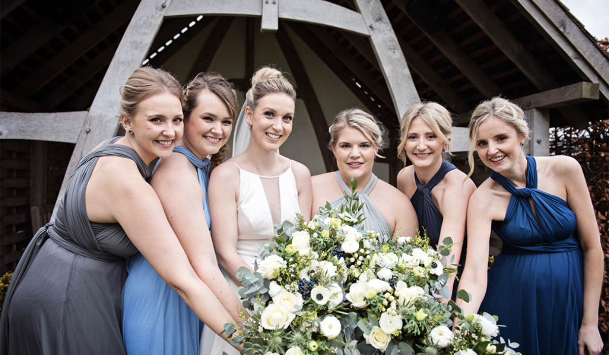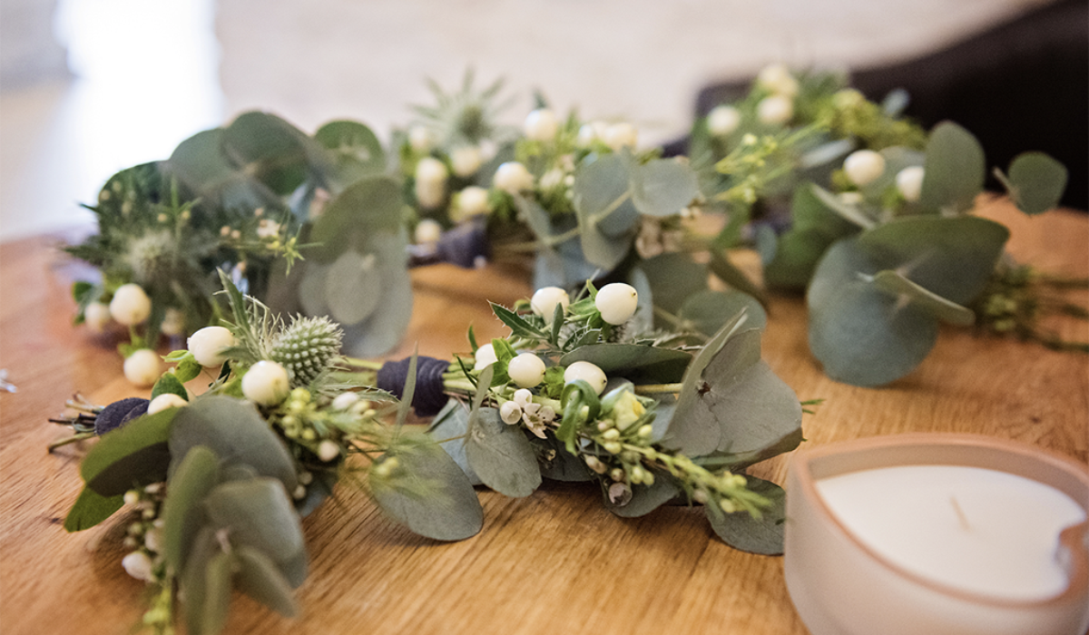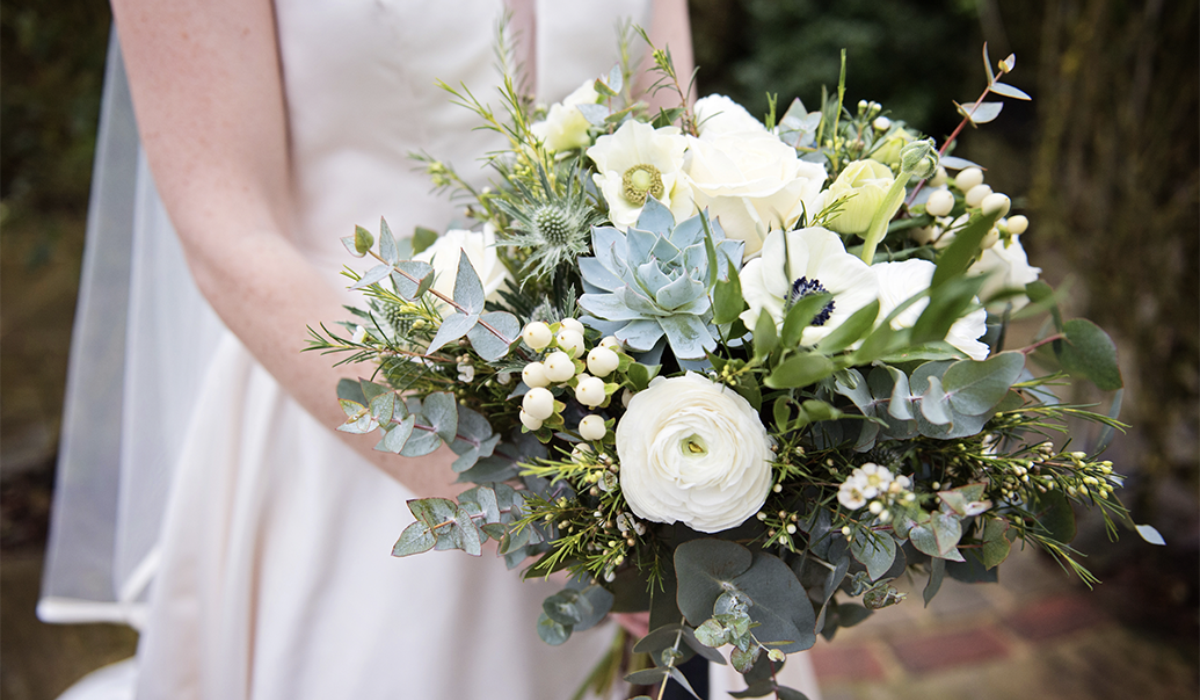 I first met with Nicola back in May 2019 for her initial wedding flower consultation. Nicola had quite a clear vision of the style and colours that she wanted and we discussed this whilst looking through her floral Pinterest boards. Due to the time of year the wedding would be (December), Nicola wanted fresh greens and whites. She wanted to incorporate lots of different types of green foliages into the wedding as there is so much on offer at that time of year; eucalyptus, ferns, ruscus, pistachio etc. Nicola wasn't too sure on the exact flower types that she liked she just loved natural and textured white blooms and did not want anything that was too structured. We talked through the seasonal flower options and discovered that she liked; roses, anemone, wax flower, ranunculus and thistle. As the bridesmaids were going to be in shades of blues and greys Nicola wanted to miss match the ribbon colours to their dresses. The ribbon was going to be velvet which just fits in perfectly with the winter theme.