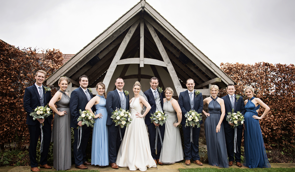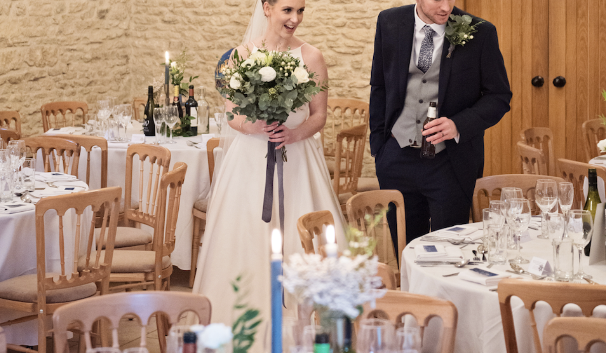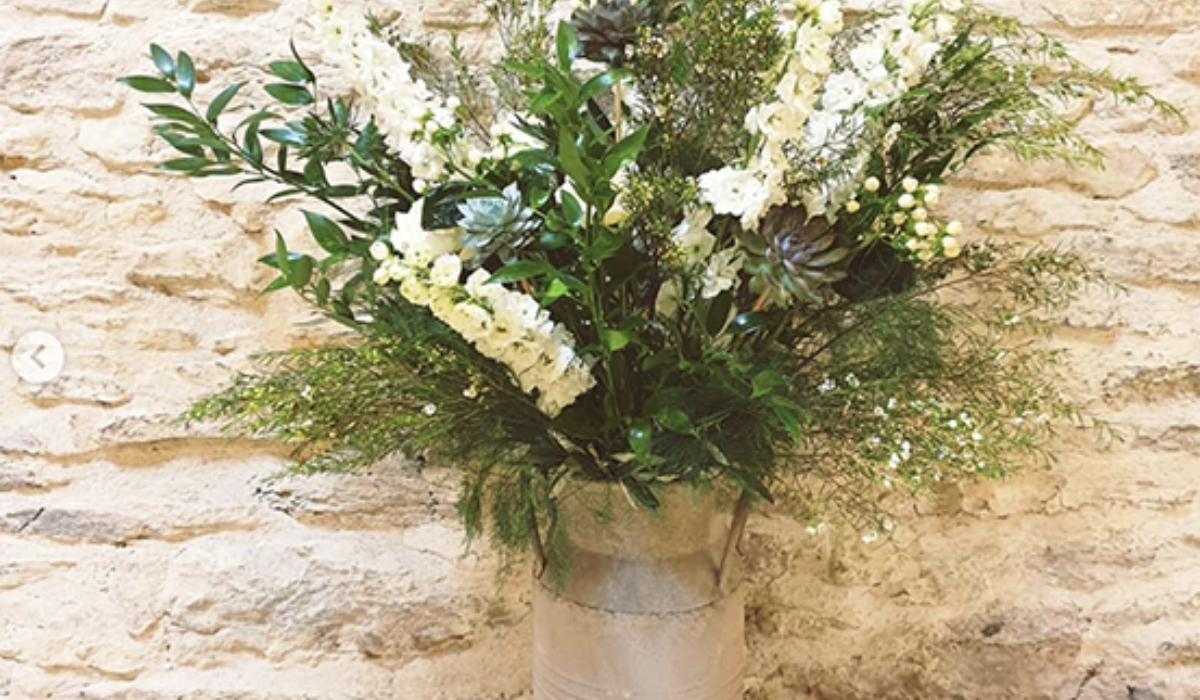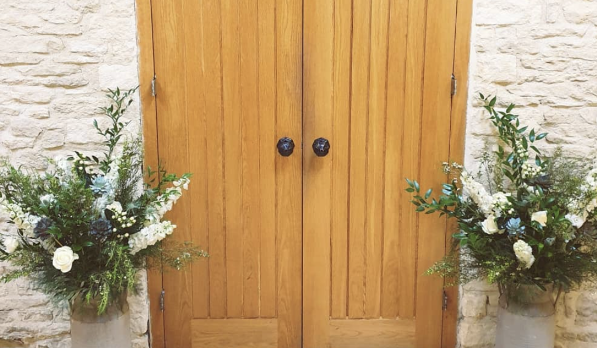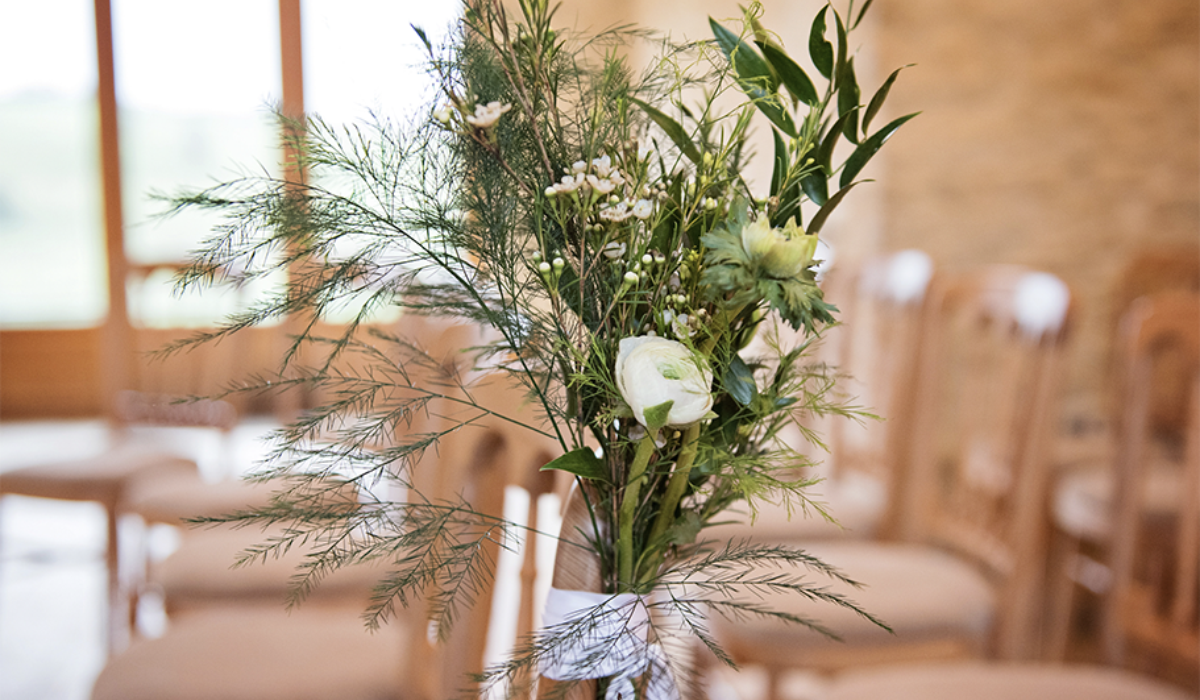 In terms of decorating the barn Nicola knew that she wanted the famous balcony of Kingscote Barn dressed in foliage with matching pew ends lining the aisle with some added white flowers. There were going to be twelve round tables and Nicola had seen a few options for these but was not decided so we spoke through different options like bottles and jars, round displays, tall displays etc. and left it with her to think about. Nicola also loved the milk churn displays so knew that she would want two of these dotted around somewhere but would also decide on this. The initial wedding flower consultation is all about discussing your ideas mixed with my expert advice and tips. Final decisions do not need to be decided at this point, unless the wedding is two months away! Usually there is time to go away and think and decide on colours etc. I always like to have things set in stone two months before the big day at the final wedding consultation. The next time I would now see Nicola would be in October 2019 but of course in between this time we stayed in close contact and I was there to answer any questions Nicola had and help her out. We decided on ribbons during this time which Nicola ended up sourcing herself as she found a beautiful grey velvet ribbon online.