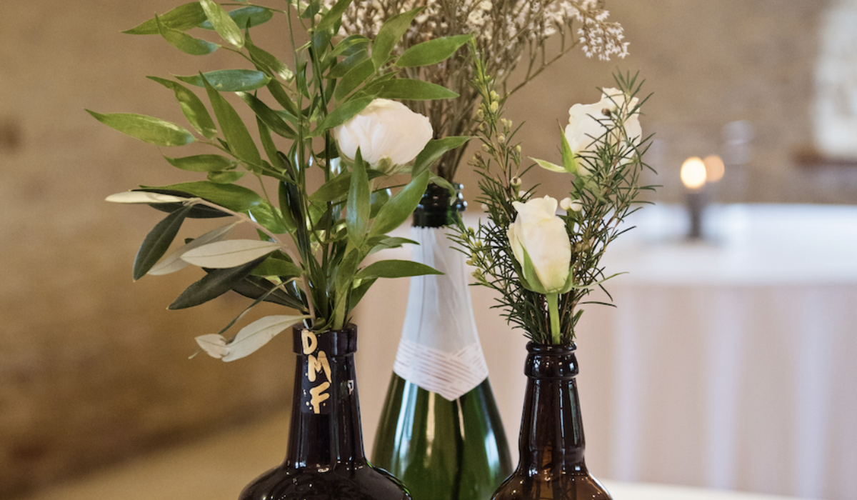 The decoration would stay as originally planned apart from the tables which Nicola had now decided on. As there was a little theme of travel running through the day and the tables were different country names Nicola and Dave decided to collect bottles of alcohol from each country for the tables. There would be three bottles filled with flowers and foliage on each table along with some greenery on the table to create the centre piece.