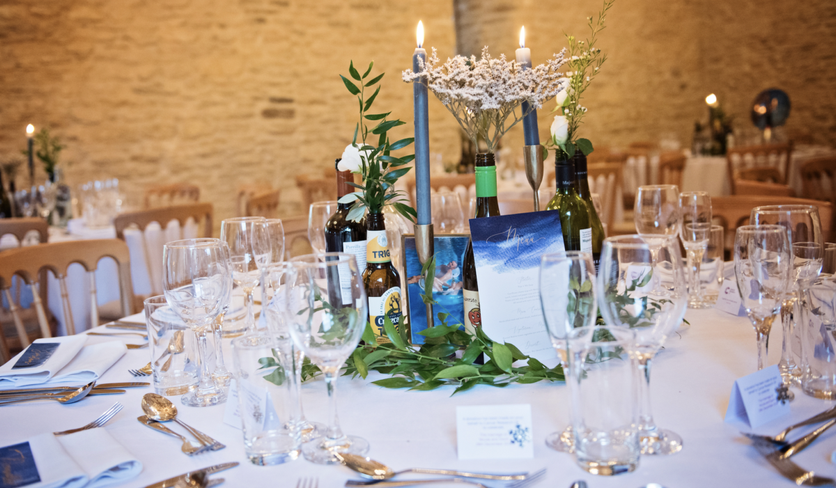 All of the wonderful wedding flowers were ordered and were collected on Christmas Eve to be conditioned due to the Christmas shut down at the market. The day before the wedding the preparations were made and on the wedding day morning I loaded up the van and drove down to Gloucestershire. I spent the morning decorating the venue before hand delivering the buttonholes and bridal party bouquets. As the ceremony room is transformed into the reception room at Kingscote Barn I stayed around to decorate the tables following the ceremony. Cleverchefs quickly and efficiently transformed the room ready for the reception while I decorated the tables with the bottles and foliage. Once this had been done I left the venue and the celebrations were ready to start!