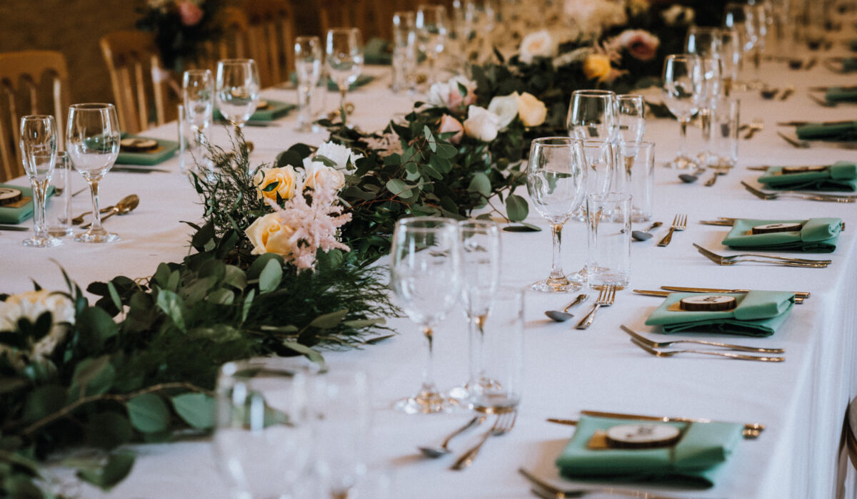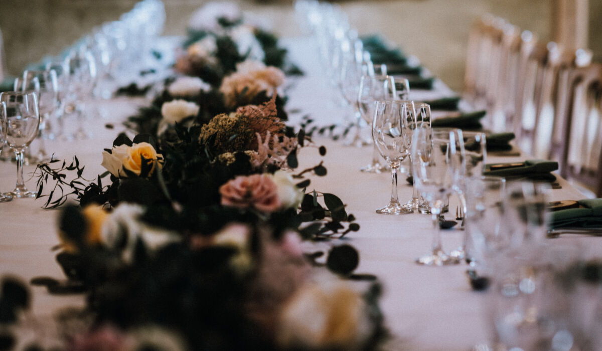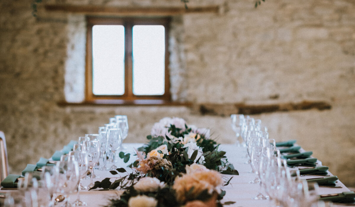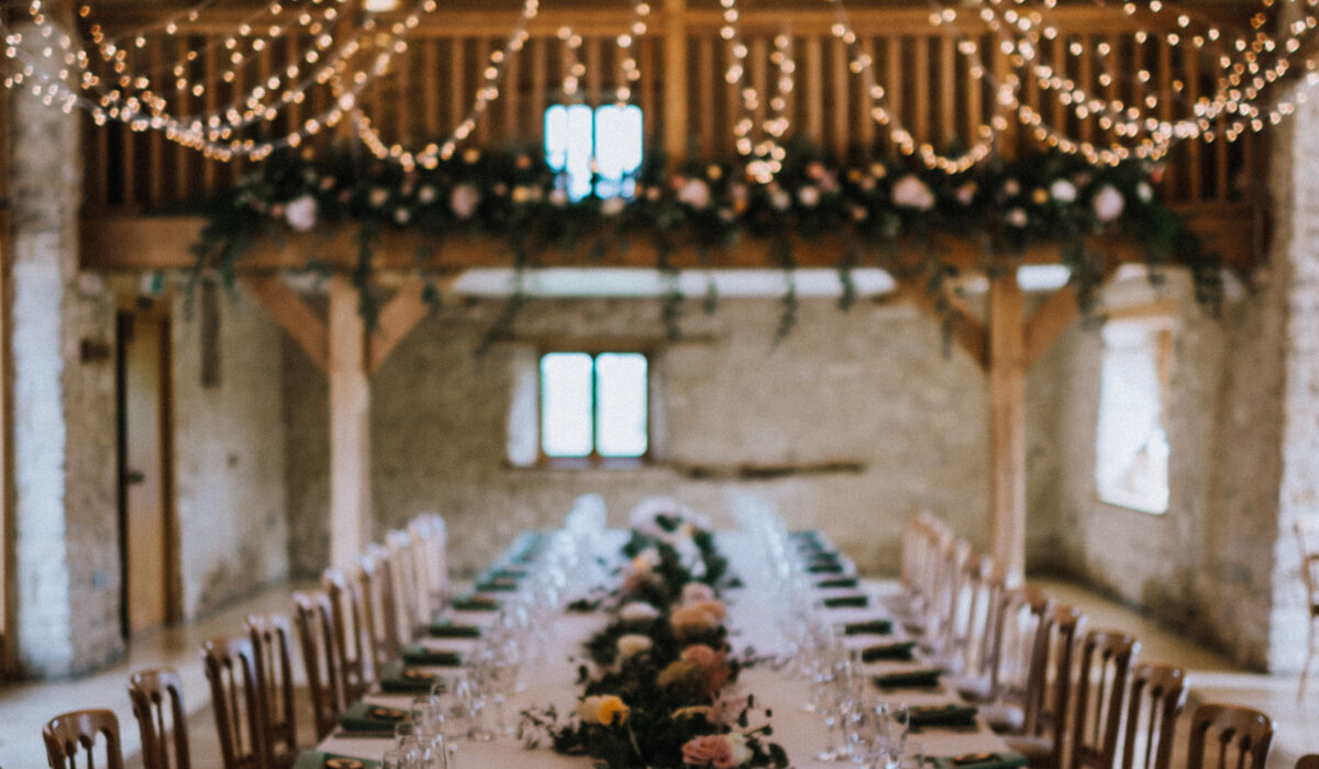 We love working at Kingscote Barn as it is always nice as a florist to return to a venue such as this where you feel comfortable and know the surroundings. Rosie and Jon went for two larger scale flower installs in the style of the wedding which was natural and seasonal with a touch of bohemia. We created a stunning full garland to decorate the balcony bursting with blooms and foliage along with flower poles to match which we created outside as it was a beautiful day and this is where the ceremony took place. These could have been moved around for the evening, but I think with no new evening guests and most of their day taking place outside they stayed where they were creating a fabulous photo opportunity. Pew ends also matched the poles to create the most stunning aisle against that breath-taking view at Kingscote. With the limited number of guests, the couple went for one long dining table in the centre of the barn which stole the show beneath the fairy lights and balcony garland. We designed a full of life foliage and flower garland running through the centre of the table along with candles and it created the most perfect dinner setting.
